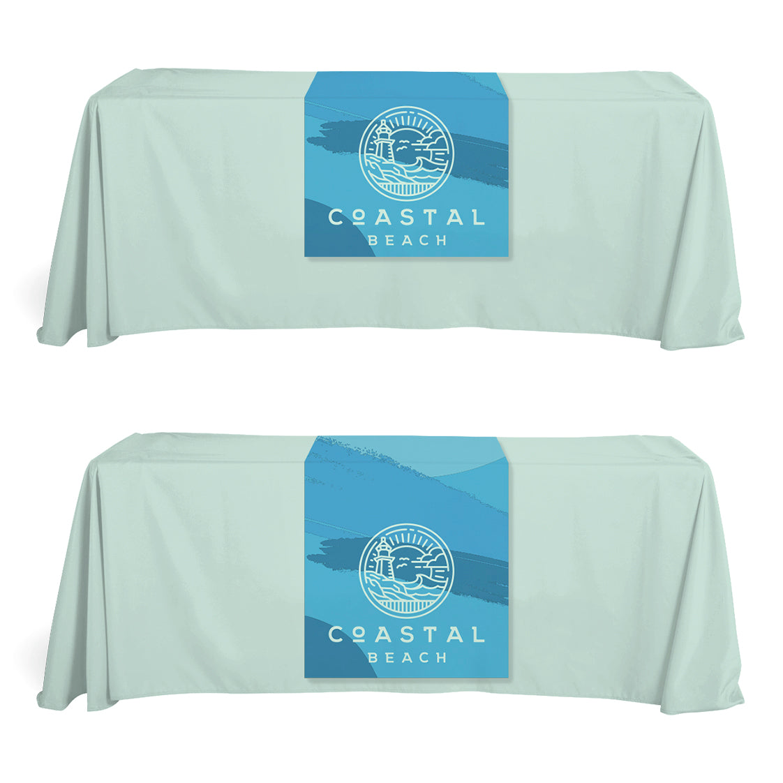 Mix things up with a logo on one side and an illustration on the other, giving you the flexibility to showcase two table runners in one!